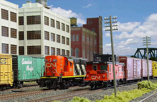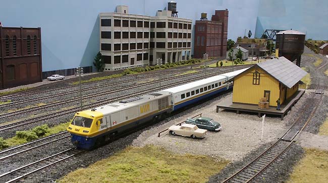 Danville was 6.0 metres long and 3.0 metres wide. Track work was code 100 and the points were controlled with Tortoise point motors. The three base boards (plywood boxes with cross bracing) were wired to a central control panel as were the three DC controllers. |