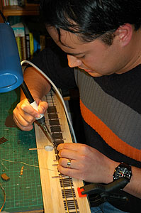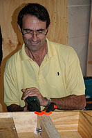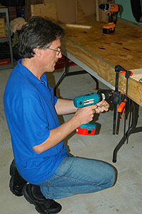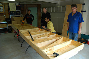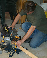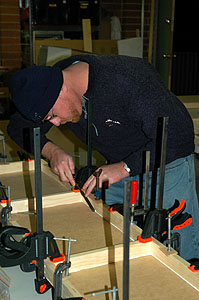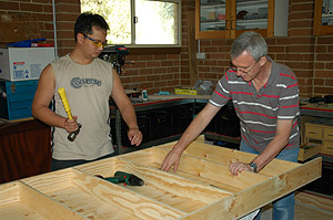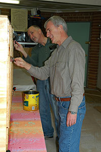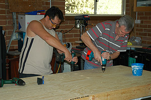 ![]() fitting the baseboards joints meant even more drillling, note Simon,on the right, supervising |
