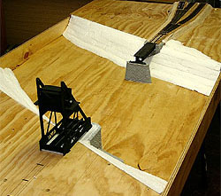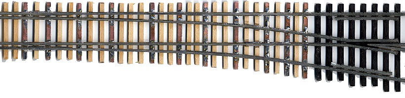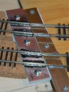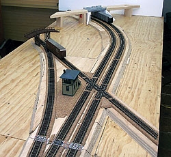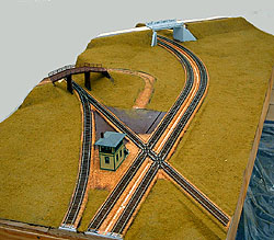 The track on the scenic portions of the layout is code 83 flex track made by Micro Engineering. The tracks are laid on 6mm cork and a 17mm ply subroadbed. The minimum radius curve is around 900mm (3 feet). The gauntlet track is hand laid. It is soldered onto copper clad fibreglass sleepers. The turnouts (points) on the front boards are made by Micro Engineering. The crossings are from Shinohara. |