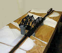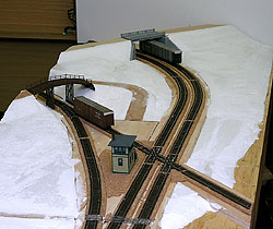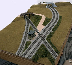 The lineside details such as relay cabinets and switch motors are white metal castings from Details West. The flashing railway crossing signals are a Busch kit. The signals were scratch built. The bridge has been adapted from the Walthers Bascule bridge kit |